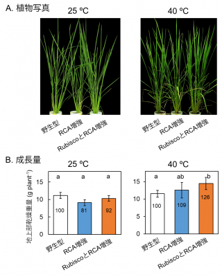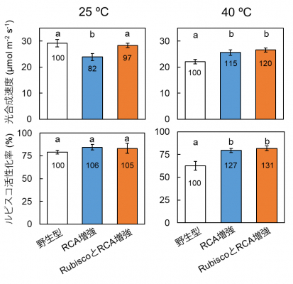 25℃および40℃における強光下の光合成速度とルビスコ活性化率を測定した。二重形質転換体イネの光合成速度とルビスコ活性化率は、野生型イネに比べて、25℃では同程度であったが、40℃では有意に高かった。RCA: アクチベース、Rubisco: ルビスコ。
