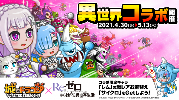 株式会社アソビズム(本社:東京都千代田区、代表取締役:大手智之)は、App Store・Google Playにて好評配信中の『城とドラゴン』で、株式会社KADOKAWA(本社:東京都千代田、代表取締役社長:松原眞樹)のテレビアニメ『Re:ゼロから始める異世界生活』とのコラボイベントを、2021年4月30日(金)より復刻開催いたします。