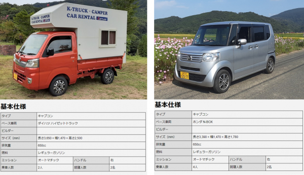 ラインナップは低価格で購入できる軽トラックベースのキャンピングカーと、人気軽自動車ホンダN-BOXベースの2車両を用意して外装内装ともに違う軽キャンピングカーを試すことができます。