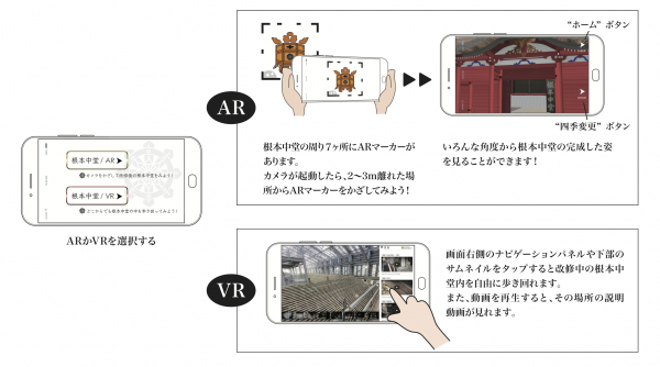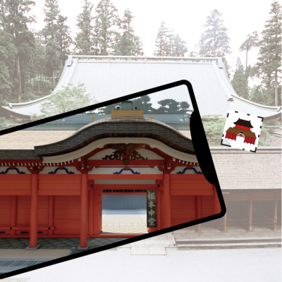 ARを選択し、根本中堂と廻廊を含む周辺7ヶ所に配置されている、ARマーカーを読み取ると、改修後の完成した根本中堂や廻廊の塗装、彩色をご覧いただけます。
