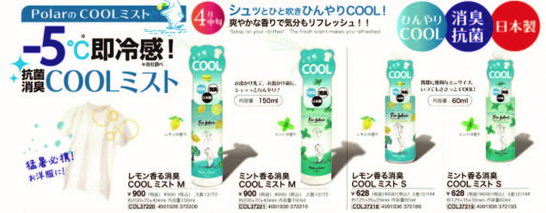 抗菌消臭のCOOLミストにさわやかなレモンやミントの香りがついています。お洋服などにシュッとひと吹きすればたちまちCOOLダウン。猛暑日の必携アイテムです。