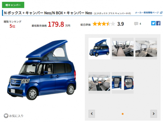 3位の「N ボックス + キャンパー Neo」も2位と同様、ホワイトハウス社が手掛ける人気の軽キャン。