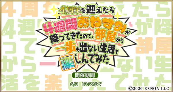 ◆イベント「4周年を迎えたら4週間おやすみが降ってきたので部屋から一歩も出ない生活を楽しんでみた」開催