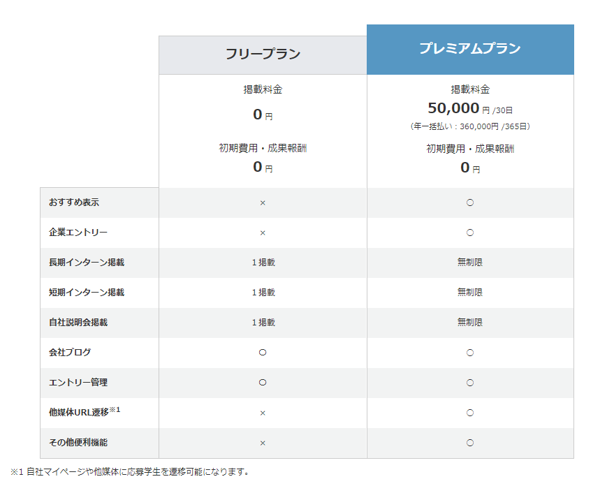 これまでのフリープランに加えて新たにプレミアムプランを作成致しました。掲載費・成果報酬無料で利用できるフリープランと機能制限無しのプレミアムプランを目的に合わせてご選択いただけます。詳細は料金プランページ(https://internshipguide.jp/company/Pages/price)をご覧ください。