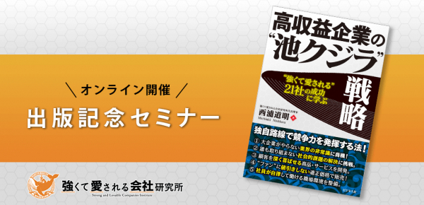 この度、『高収益企業の“池クジラ”戦略-“強くて愛される”21社の成功に学ぶ!-』(西浦道明 著)を出版、これを記念してセミナーを開催します。