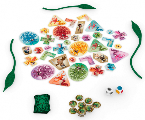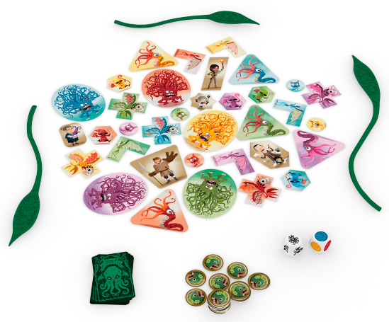 ●内容物/粘つく触手8本、クリーチャー・タイル30枚、探索者タイル5枚、ディープワン・トークン30枚、呪いカード12枚、クリーチャー・ダイス1個、色ダイス1個、ルールブック1部