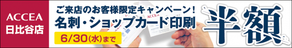 期間内に日比谷店の店頭へ名刺印刷をご注文のお客様はデータ作成代、名刺印刷代が半額となります。