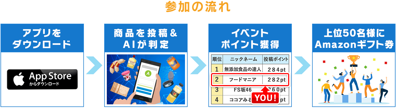 「フードスコア チャレンジ」は、アプリで市販食品の健康度をチェックし、実際に食べて写真や感想を投稿するイベントです。投稿商品の健康度(AIがA~Eの5段階で評価)に応じて、投稿者はイベントポイントを獲得します。