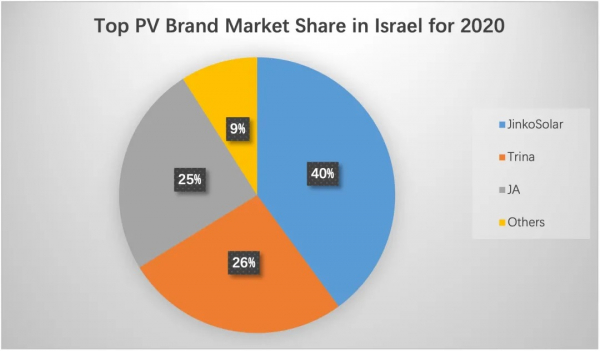 4月25日、ニュースレポートと分析を公開したオンライン新聞のタイムズオブイスラエルは、2020年のイスラエルにおけるトップのPVブランドの市場シェアを発表した。統計によると、イスラエル2020年の太陽光発電市場の導入量は850 MWを超え、ジンコソーラーが340 MW(約40%)とイスラエル首位であった。