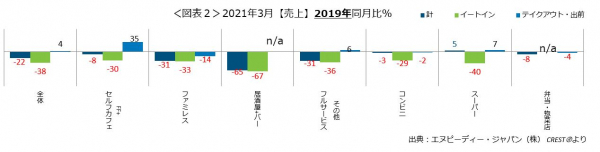 外食・中食市場の2021年3月は、売上21.9%減(2019年同月比)