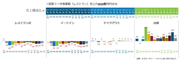 外食業態計(レストラン計)の売上2019年同月比を利用形態ごとにみてみると(図表3)、出前(デリバリー)の大幅増が続いており、4月は28%増、5月は204%増、6月は104%増、7月は75%増、8月は23%増、9月は44%増、10月は39%増、11月は68%増、12月46%増、1月81%増で、2月132%増で、3月は46%増(いずれも2019年同月比)と2桁成長が続いています。