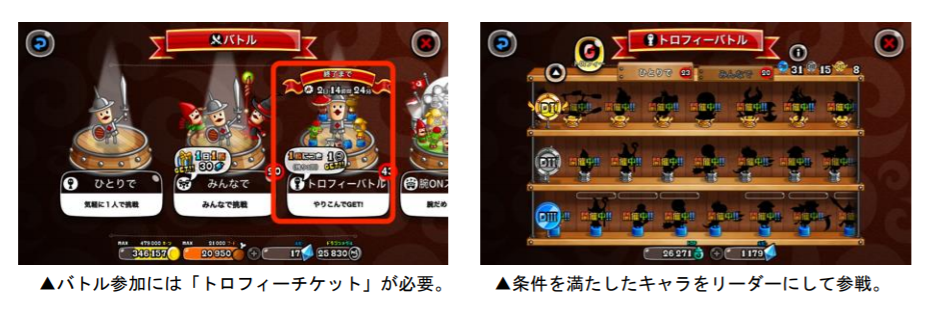 「トロフィーバトル」は、出場条件を満たしたキャラをリーダーにして戦い、“トロP”を獲得することが目的のバトルです。一定数のポイントがたまると、さまざまな報酬のほか、キャラの能力値が上昇する“D1武具”などが入手できます。