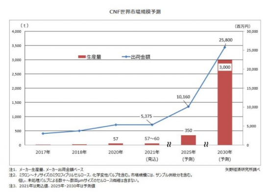 株式会社矢野経済研究所(代表取締役社長:水越孝)では、2021年のセルロースナノファイバー(CNF)世界市場を調査し、市場動向、参入企業動向、将来展望を明らかに致しました。