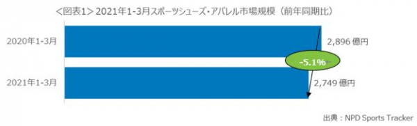 スポーツシューズ・アパレル市場規模、2021年1月-3月は前年同期比5.1%減
