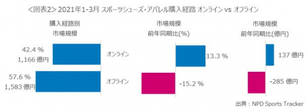日本の2021年1-3月のスポーツシューズ・アパレル市場規模は2,749億円と、新型コロナウイルス感染拡大の影響により、前年同期比5.1%減でした。(図表1)