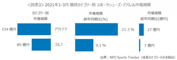 競技カテゴリー別に見ると(図表3)、マイナス成長のカテゴリーが多い中、アウトドア市場とゴルフ市場がそれぞれ前年同期比21.3%増、9.1%増と、大きく成長しました。どちらの競技カテゴリーも2020年のマイナス成長からの回復を見せています。