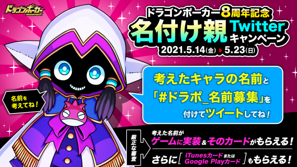 株式会社アソビズム(代表取締役:大手智之)は、AppStore・Google Playにて好評配信中のリアルタイム合体カードバトル『ドラゴンポーカー』のサービス開始8周年を記念し、「名付け親Twitterキャンペーン」を2021年5月14日(金)より開催することをお知らせいたします。