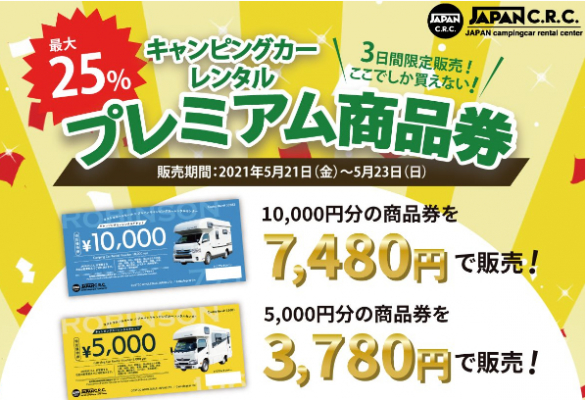 日本最大級のキャンピングカーのレンタル事業「ジャパンキャンピングカーレンタルセンター(以下 JAPAN C.R.C.)https://japan-crc.com/」を運営するキャンピングカー株式会社(本社:東京都千代田区、代表取締役社長:頼定 誠)は、コストコホールセールジャパン株式会社が運営する千葉県にある幕張倉庫で提携第一弾となるプレミアム商品券販売イベント(以下 ロードショー)を2021年5月21日(金)~2021年5月23日(日)で開催いたします。
