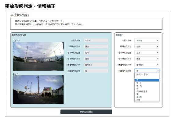 AI判定によって抽出された事故状況は手入力での補正も可能となっており、判定が間違っていた場合は修正が可能です。ドライブレコーダー映像がない場合にも、条件を手入力することでデータベースとのマッチングを活用することができます。