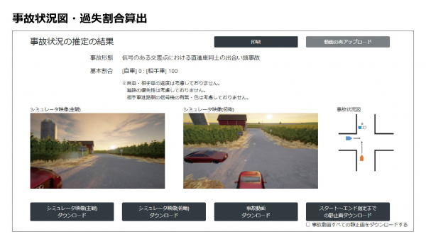 「事故状況推定システム」は、ウタゴエ株式会社と共同で開発したAI画像処理技術を用い、ドライブレコーダーの録画データから「交差点形態」「自車・相手車の進行方向」「信号機の有無・色」を識別・抽出し、過去の判決事例をもとに作成したデータベースとパターンマッチングすることで、事故形態と基本過失割合、事故状況図を出力します。これにより、誰でも客観的かつスピーディーに事故状況の判定が可能になります。さらに、事故状況の理解を助ける、3D化した主観・俯瞰視点のシミュレーター映像をダウンロードできます。