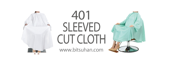 「401 しわ加工袖付カットクロス」は、生地にシワ加工を施し通気性と使い心地に優れたカットクロス。肌への密着を最小限にとどめ、サラっとした軽い着心地が特徴です。カットした髪の毛がクロスに付着せずに落ちやすく、クロスの縁がラウンド型なので、お客様が座った際に前側が長めになり切った髪が流れ落ちるようになっています。大きめのスタイリングソファでも使えるゆったりサイズで、お客様にも施術者にもうれしい機能的なクロスです。