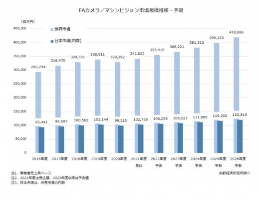 株式会社矢野経済研究所(代表取締役社長:水越孝)では、FAカメラ/マシンビジョンの世界市場を調査し、参入企業の動向、企業シェア、将来展望を明らかに致しました。ここでは、FAカメラ/マシンビジョン世界市場および日本市場規模推移について、公表致します。