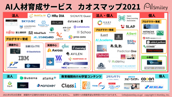 人工知能を搭載したサービスの資料請求ができるAIポータルメディア「AIsmiley」を運営するアイスマイリー(東京都渋谷区、代表取締役:板羽晃司)は、AI人材を育成するための研修サービスをまとめたAI人材育成サービスカオスマップ2021を2021年5月24日に公開します。掲載数は合計72サービス。