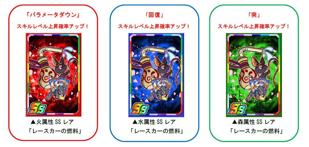 限定強化素材「レースカーの燃料」は一部のモンスターに使うと強化値2倍の効果があるほか、パラメータダウン・回復・突のスキルレベル上昇確率もアップします。