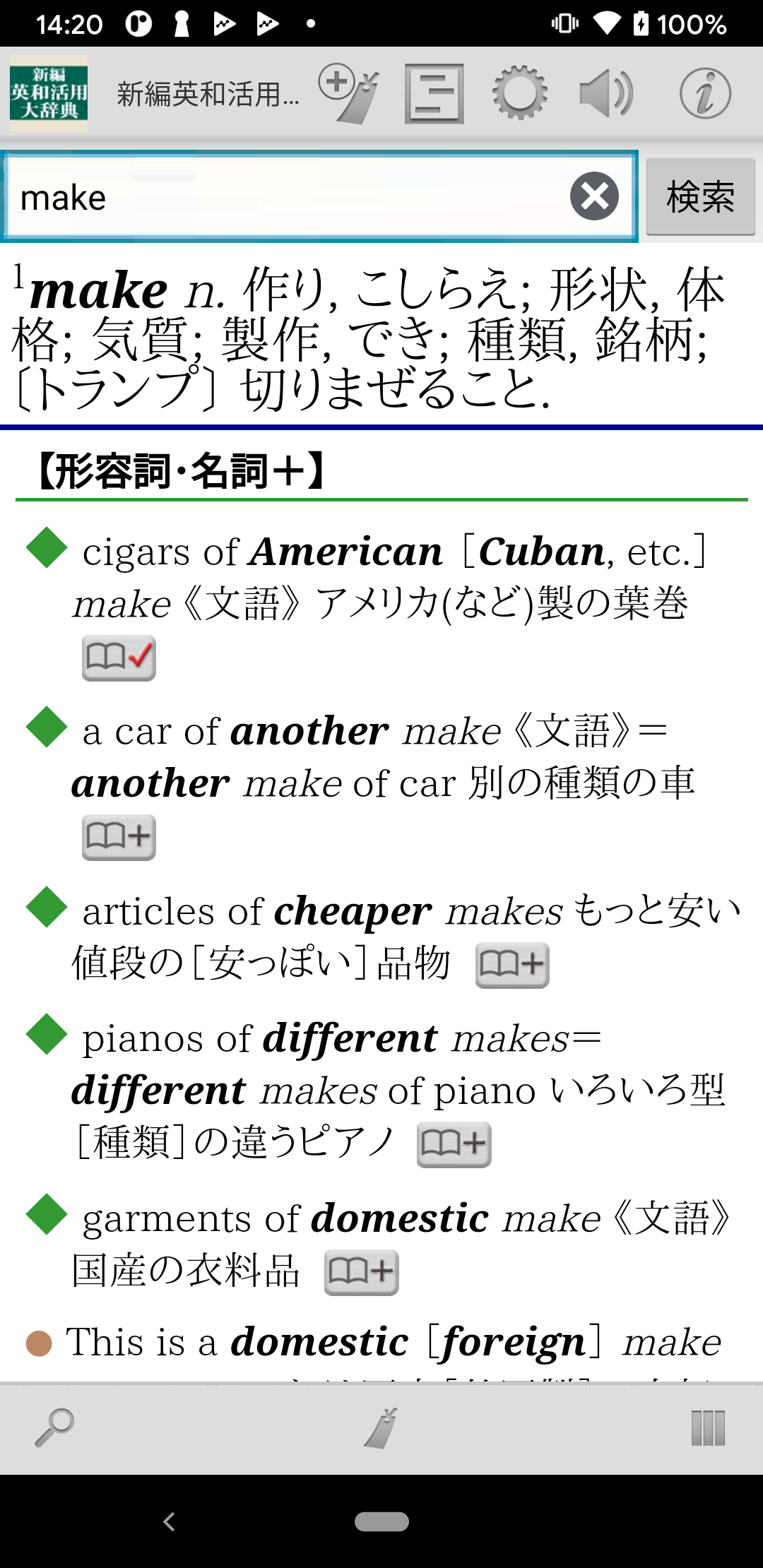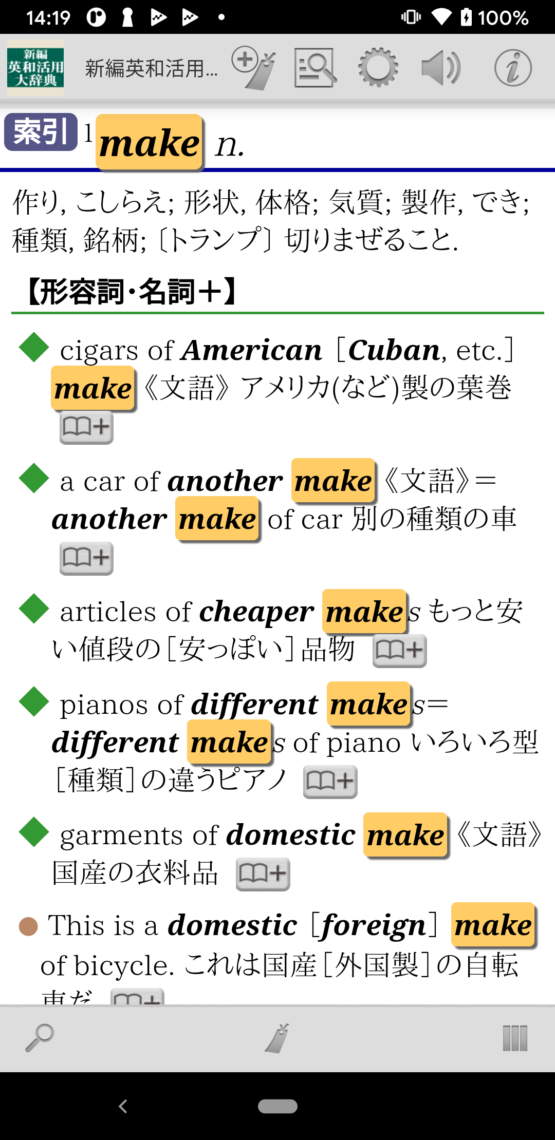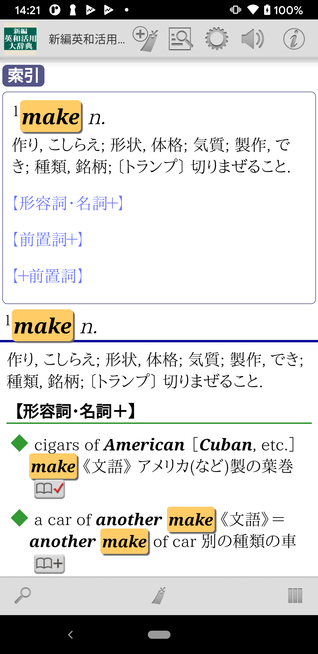・辞典項目単位のしおり登録の他に、項目内の用例等を個別にしおりに登録可能です。