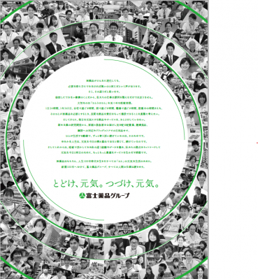 この広告デザインは、富士薬品グループで働く全従業員から募った写真で作られており、このスローガンを中心に一体となりながら広がっていく様子をイメージしています。
