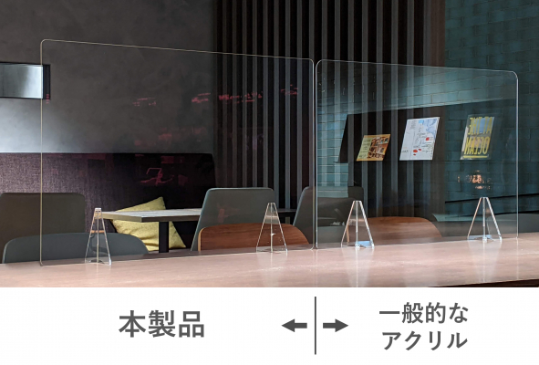飛沫拡散を防止して空間を仕切りつつ空間に溶け込む、いわば"見えない仕切り"を理想形とする透明パーテーションですが、照明や窓からの光がぎらぎらと反射して反対側が見えづらかったり、正面に座った自分自身が映り込んだりと、表面の反射が煩わしさの要因になっていました。