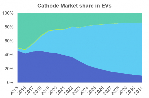 図 : 電気自動車用リチウムイオン正極材の市場シェア. 出展: IDTechEx