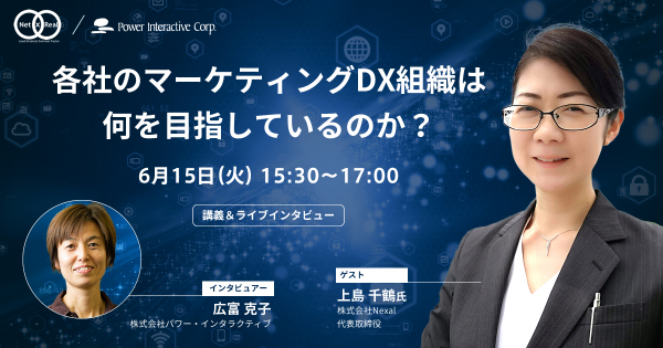 株式会社パワー・インタラクティブは、マーケティング組織の成長・発展に課題を抱えている経営層やCMOの方、DX推進部門の方を対象に、株式会社NEXAL 代表取締役 上島千鶴氏をお招きし、著書『営業を変えるマーケティング組織のつくりかた』について講演+Liveインタビュー形式で深掘りする無料ウェビナー『各社のマーケティングDX組織は何を目指しているのか?』(参加無料)を、6月15日に開催します。