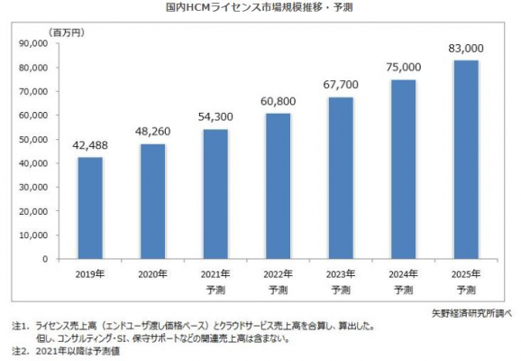 2021年のHCMライセンス市場規模は、前年比12.5%増の543億円になると予測する。現在も新型コロナウイルスの影響は続いており、HCM市場では2020年と同様、プラス・マイナス双方の影響がありながら、プラスの影響がマイナスを上回り好調に推移する見通しである。