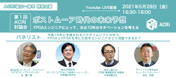 ACRiはFPGAの活用方法を模索・研究する団体です。より多くの方にFPGAを楽しんでほしいと考えているACRiでは、ウェビナーを通じてFPGAの学び方・楽しみ方や活用事例を紹介していきます。本討論会では「ポストムーア時代の未来予想~FPGAエンジニアにとって、次の10年のモチベーションを考える~」と題し、オンラインでのパネルディスカッション形式での開催となります。業界を代表するキーマンに「今後10年に予想されるパラダイムシフトの中で、FPGAとFPGAを学んだ若手エンジニアがどう活躍できるか?」というテーマで、次代を担うエンジニアに向けたアドバイスを行います。