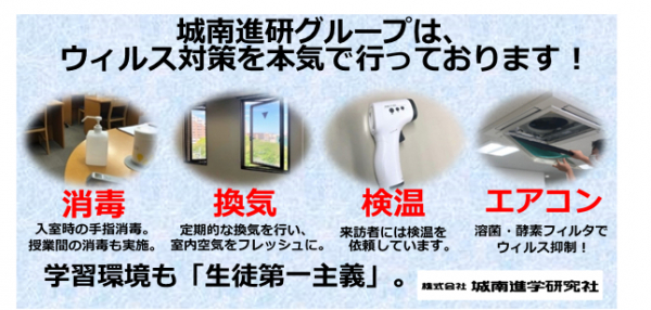 当社は「生徒第一主義」を貫き、これからも生徒の皆様が安心して勉学に取り組めるよう、城南進研グループ一体となって細菌・ウィルス対策に努めてまいります。
