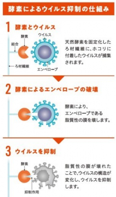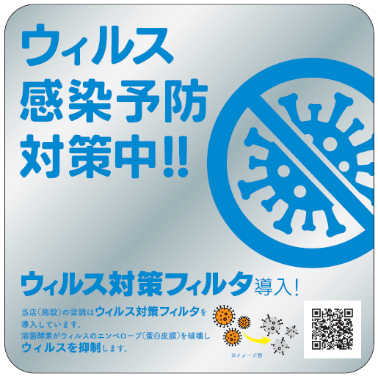 本フィルタの設置により、捕集した粉塵に付着したウィルスを酵素の力で抑制し、室内清浄度が既設フィルタ効率の約3倍アップすることとなります。また、導入した教場においては、感染対策への取り組みを示す「ウィルス対策フィルタ導入」ステッカーを掲示します。