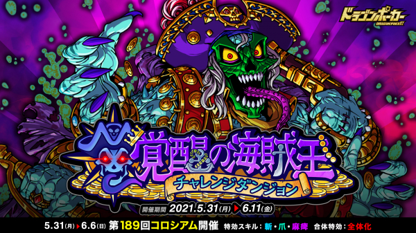 株式会社アソビズム(本社:東京都千代田区、代表取締役:大手智之)は、App Store・Google Playにて好評配信中のリアルタイム合体カードバトル『ドラゴンポーカー』で、2021年5月31日(月)より、復刻チャレンジダンジョン「覚醒の海賊王」を開催いたします。