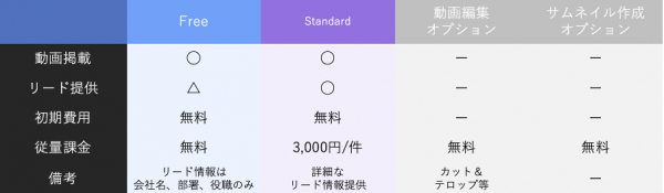 掲載自体に費用はかからず、視聴したユーザーのリード情報を提供する際に費用が発生する「成果報酬制」ですが、今回のFreeプラン導入により、ユーザーの動画視聴回数に関わらず完全無料で掲載いただけるようになりました。