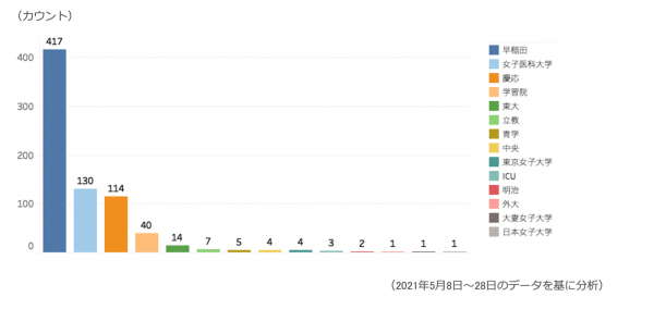 高田馬場・早稲田周辺の大学生の様子です。早稲田が群を抜いて多いですが、女子医科大学、慶応も多く、近隣の学習院も多いことが分かります。