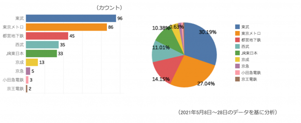 池袋周辺の鉄道の利用傾向です。池袋駅に乗り入れている鉄道の利用が相対的に多いことが分かります。中でも東武、東京メトロの利用が最も多いことが伺えます。池袋駅への乗り入れがない都営地下鉄が上位に来ていることが興味深いです。