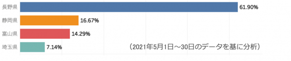 都内のある観光施設に、東京以外のどこの都道府県から多く訪れているかを見てみると、関東以外の長野や静岡、富山から多く訪れていることが分かります。
