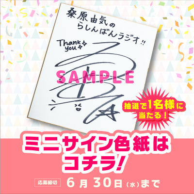 2021年6月7日(月)~6月30日(水)の期間中、らしんばん秋葉原店新館で1,000円(税込)以上お買い上げの方に応募券を配布。ご応募いただいた方の中から抽選で1名様に、桑原由気さん直筆のミニサイン色紙をプレゼントいたします。