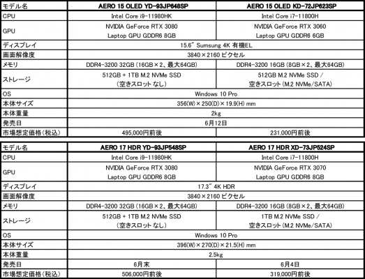 https://www.gigabyte.com/jp/Laptop/AERO-15-OLED--Intel-11th-Gen
