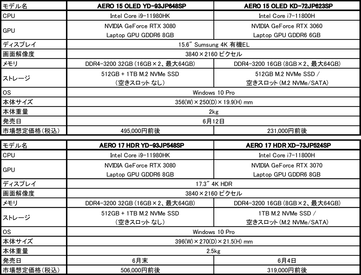 2021年6月4日 - GIGABYTE Technology Co., Ltd. 台湾・新北市 - コンピュータテクノロジーで世界をリードするGIGABYTE Technologyは、CPUに10nmプロセスで製造された高性能モバイルCPUである第11世代Intel Core Hプロセッサを採用したクリエイター向けノートPC「AEROシリーズ」に、ベースクロック2.6GHz、Turbo Boost時5GHz動作を実現する8コア/16スレッドCPUのIntel Core i9-11980HK搭載モデルなど4製品を追加し、6月4日より順次販売を開始いたします。