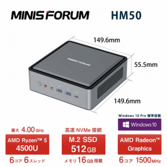MINISFORUM HM50は、AMD Ryzen(TM) 5 4500Uを搭載した超小型のデスクトップパソコンです。6コア6スレッド、最大4.0GHz動作の高性能CPUとRadeonTM Graphics、16GBメインメモリ、512GB M.2 NVMe SSD搭載を搭載したハイスペックかつ省スペースなモデルです。4K/60fpsの映像出力に対応するHDMI 2.0、DisplayPortとUSB-Cを前面に搭載、高速無線LAN Wi-Fi 6 (802.11ax)、Bluetooth 5.1と、有線ギガビットLANポート2基を備え、モニター裏に固定できるVESAマウンタが付属します。ゲーミングや画像編集から在宅ワーク、デジタルサイネージなどの業務用途まで幅広く活用できます。