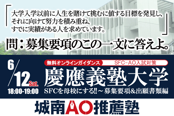 2021年6月12日(土)、株式会社城南進学研究社(所在地:神奈川県川崎市、代表取締役社長CEO:下村勝己)が運営する総合型・学校推薦型選抜対策専門塾「城南AO推薦塾」(塾長:川原洋孝)は、慶應義塾大学SFC(総合政策学部・環境情報学部)のAO入試について解説する無料オンラインガイダンス「慶應義塾大学 SFCを母校にする!!~募集要項&出願書類編」を開催いたします。