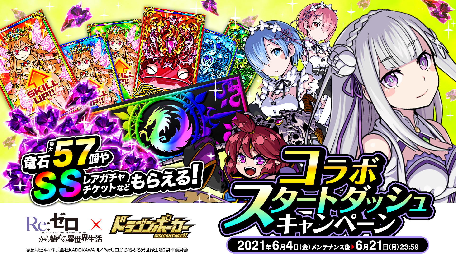 株式会社アソビズム(本社:東京都千代田区、代表取締役:大手智之)は、App Store・Google Playにて好評配信中の『ドラゴンポーカー』とTVアニメ『Re:ゼロから始める異世界生活』のコラボを記念して「Twitterプレゼントキャンペーン」を、2021年6月4日(金)より実施することをお知らせいたします。