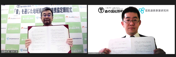 (写真:左から、松野町 坂本浩 町長、株式会社官民連携事業研究所 代表取締役社長 鷲見 英利)