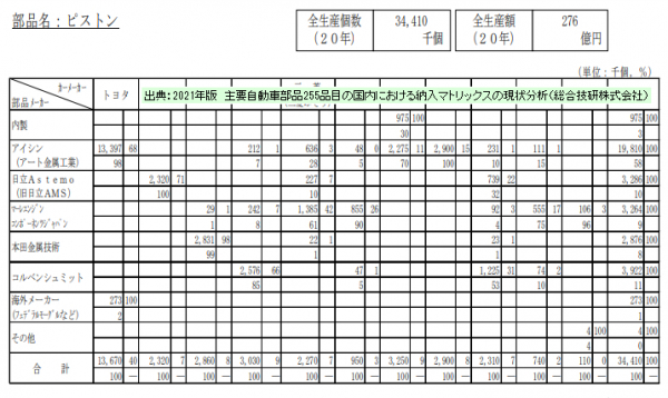 「2021年版 主要自動車部品255品目の国内における納入マトリックスの現状分析」は総合技研が入手・把握している主要自動車部品255品目の部品メーカー→カーメーカーへの納入先および納入量の情報を基にまとめられています。